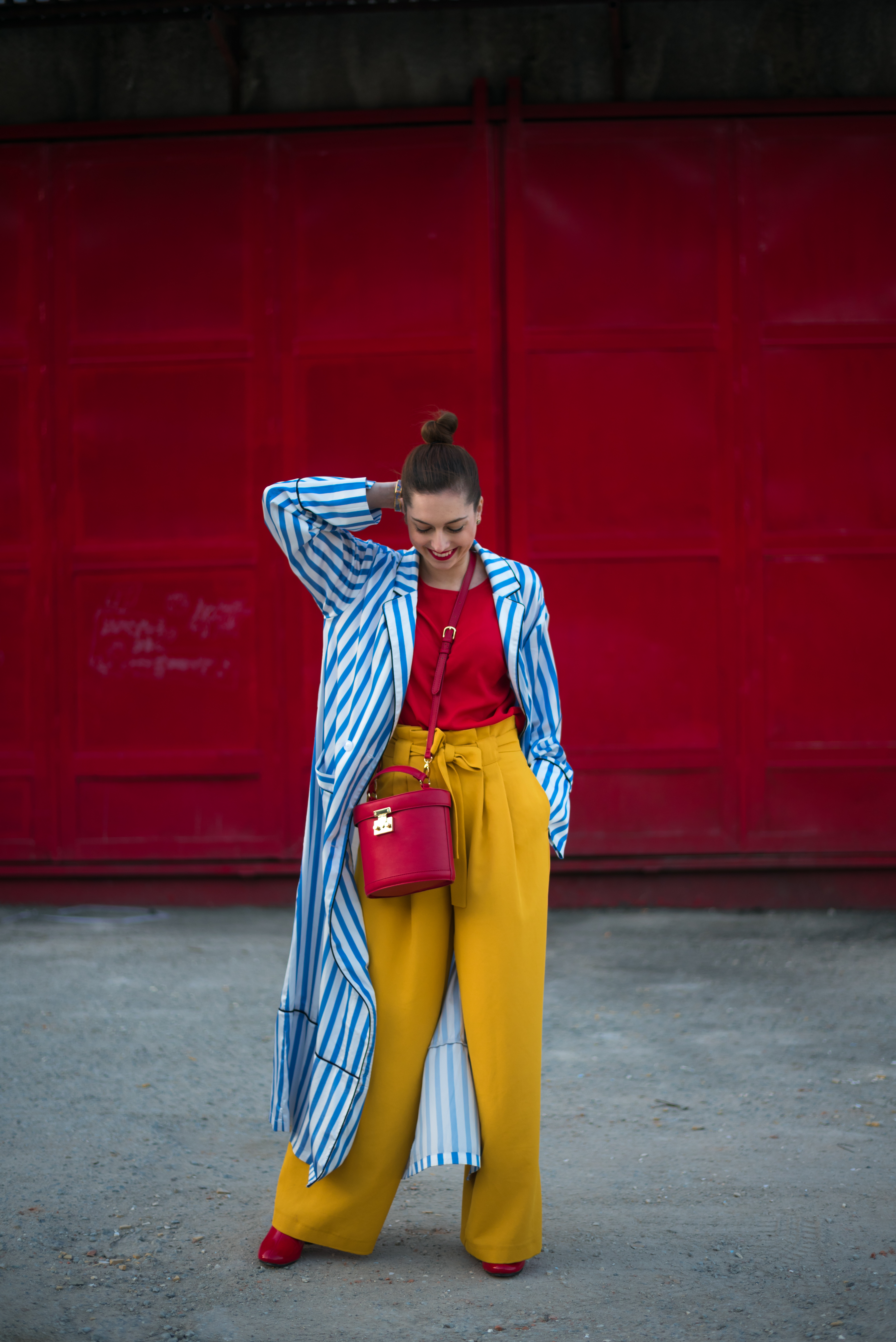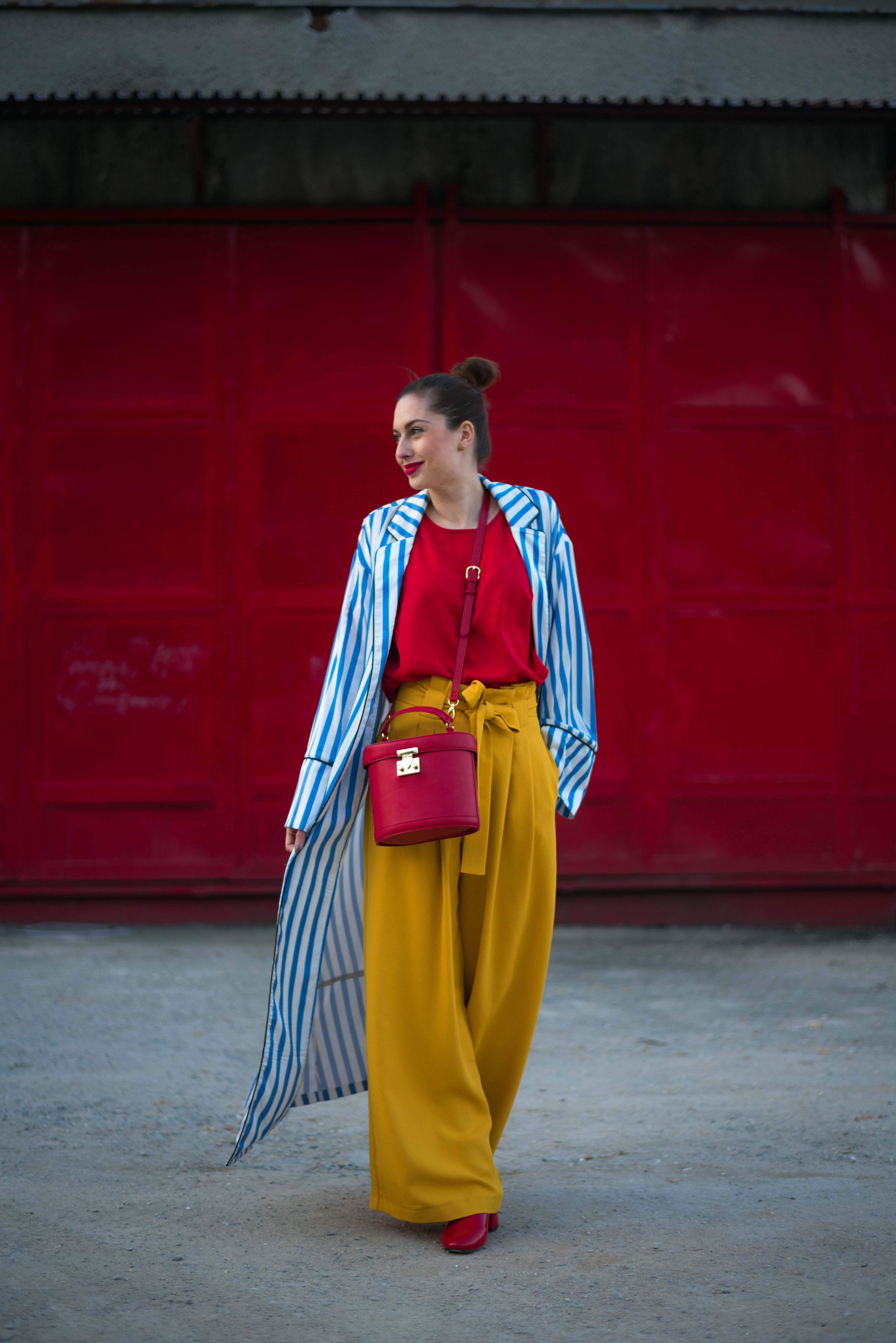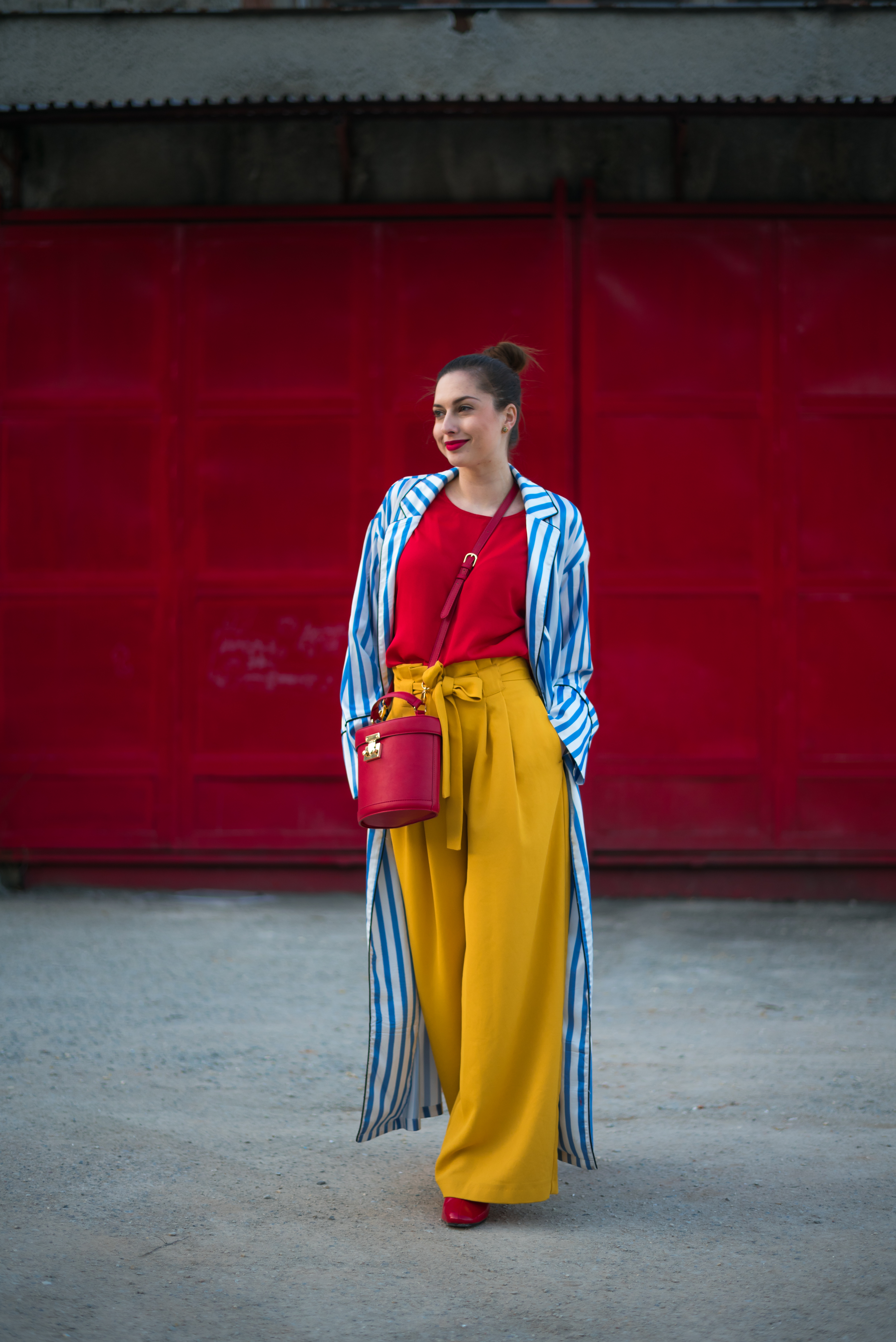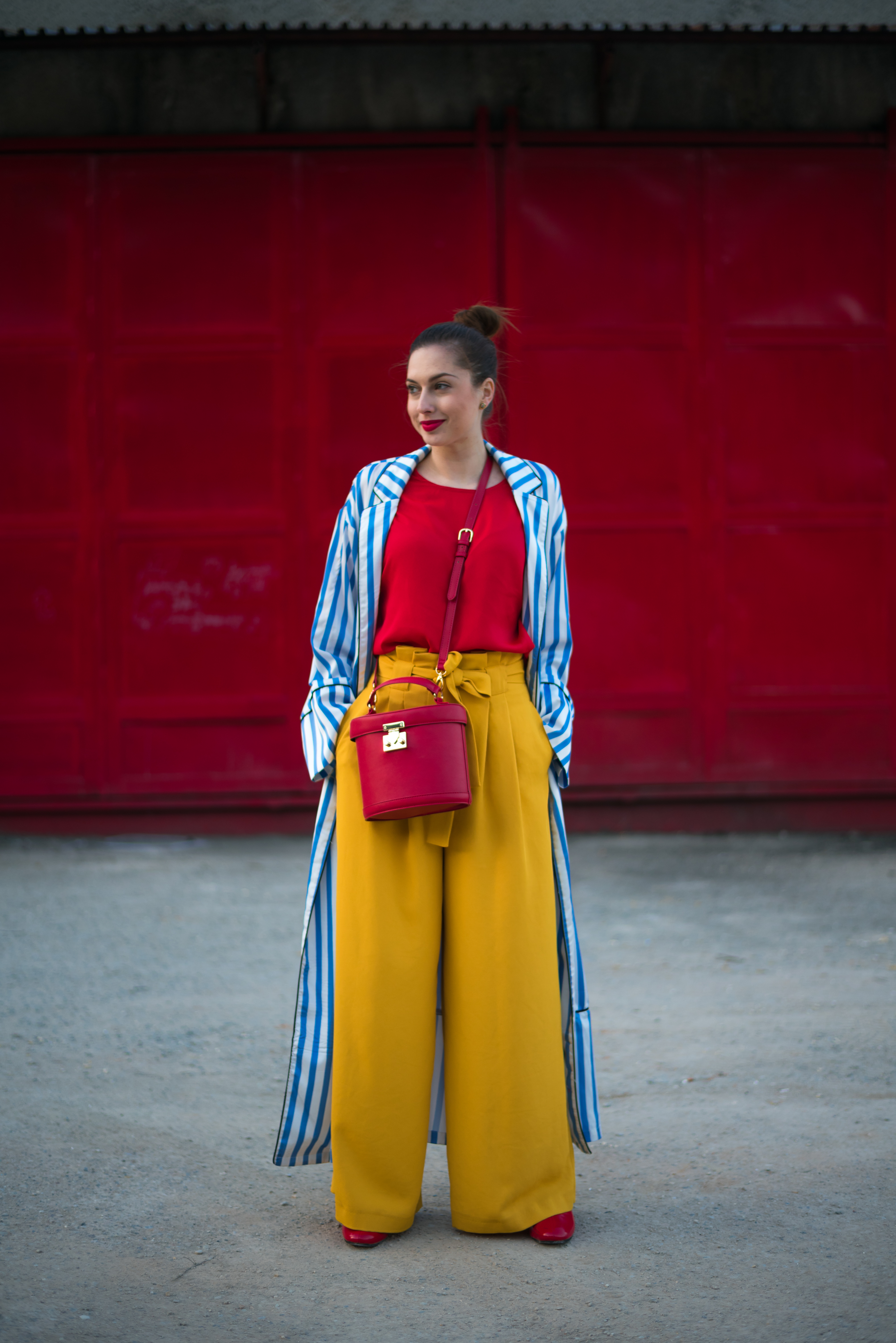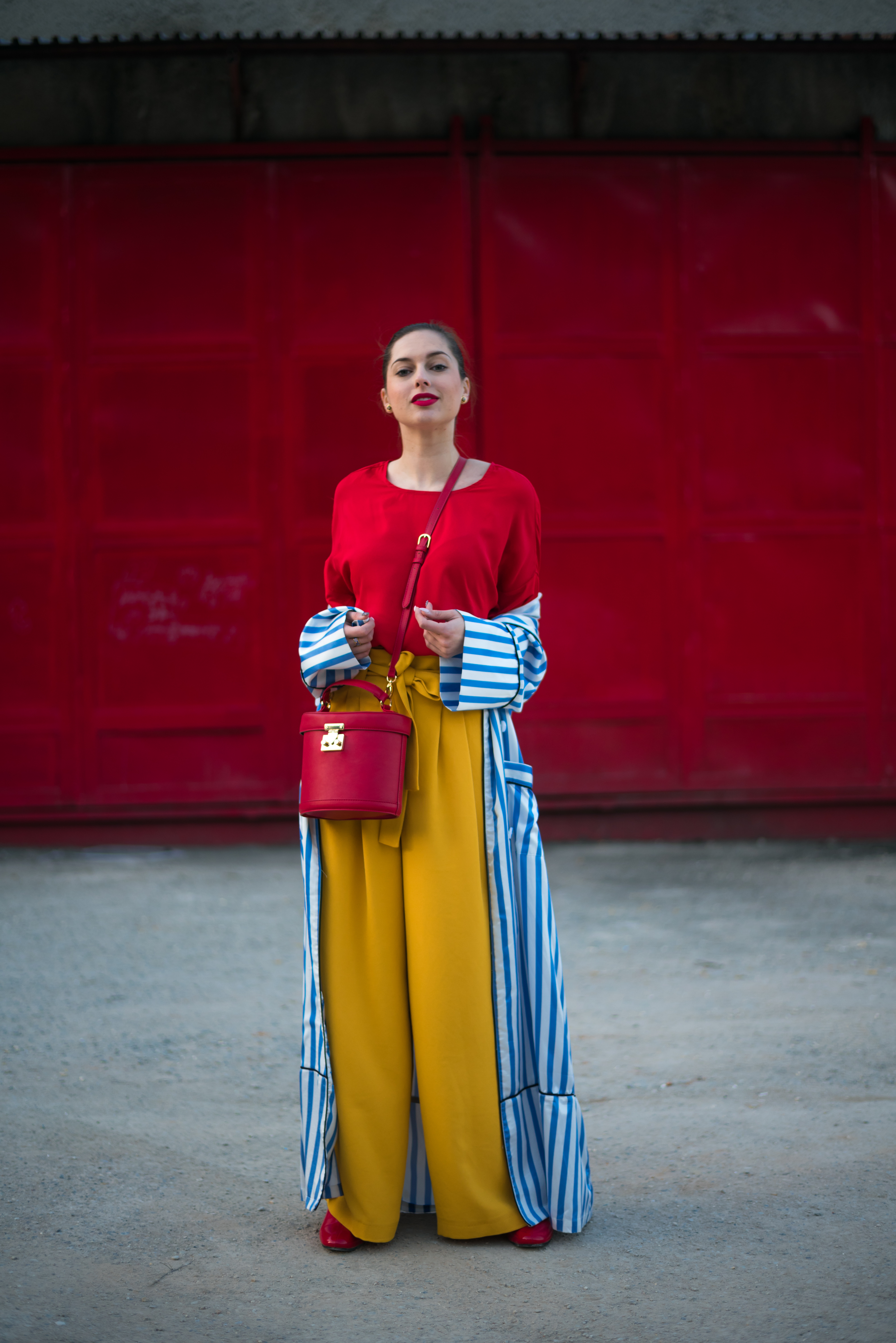 Bola to láska! Najskôr som ich objavila v ružovej verzii a chcela si kúpiť tie, no pri skúšobných kabínkach boli zavesené tieto žlté a zaujali ma o čosi viac. Dnes som ich skombinovala v štýle, ktorý pre mňa nie je úplne typický, no cítim sa v ňom perfektne. Voľné široké nohavice s vysokým pásom, dlhé voľné kimono a padavý top – skvelé trio, ktoré pasuje takmer každému typu postavy. Predĺži siluetu a celé je to veľmi pohodlné. A musím podotknúť, že kombinácia červenej, žltej a modrej ma robí neskutočne šťastnou! Tieto farby sú spolu tak pekne pozitívne…