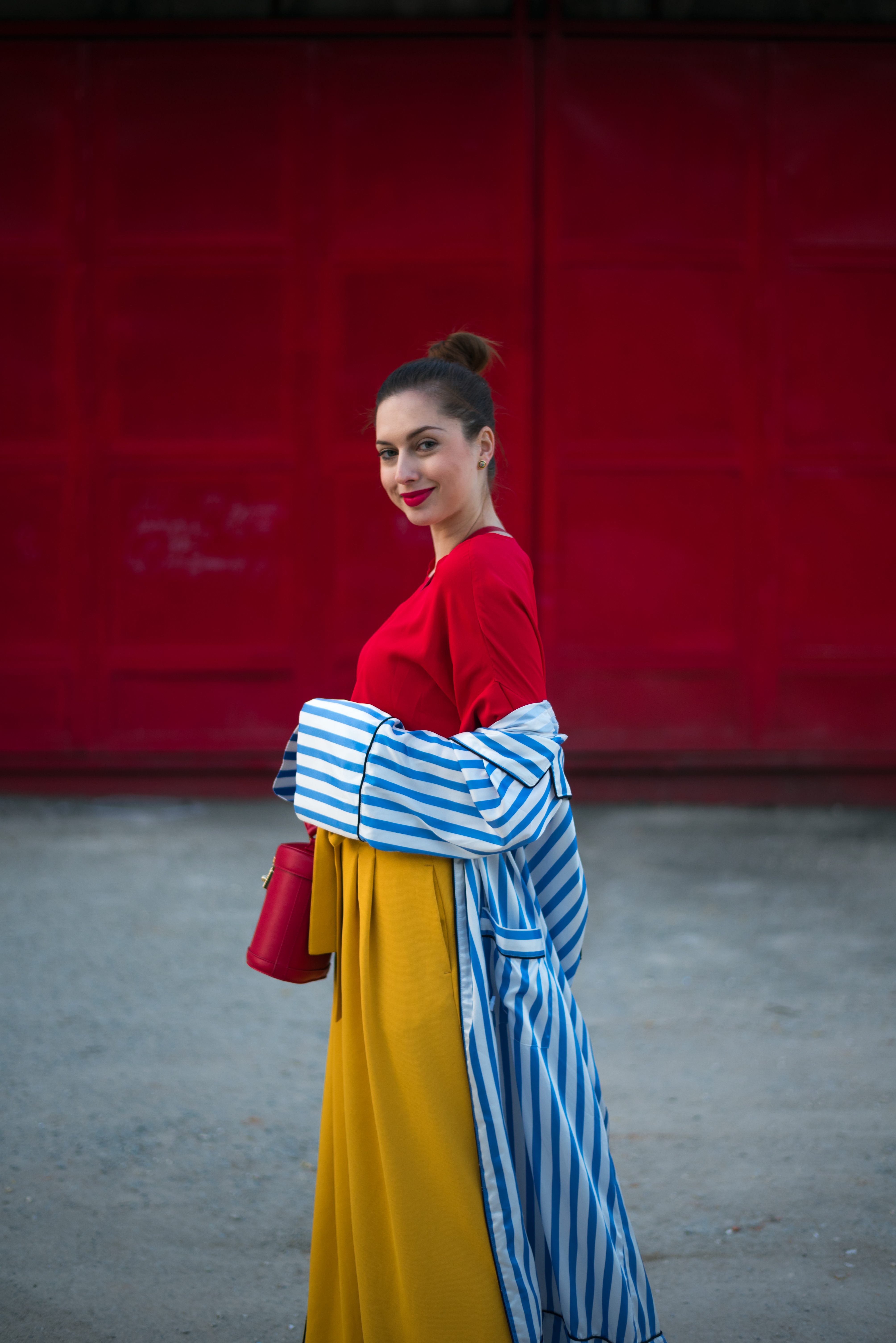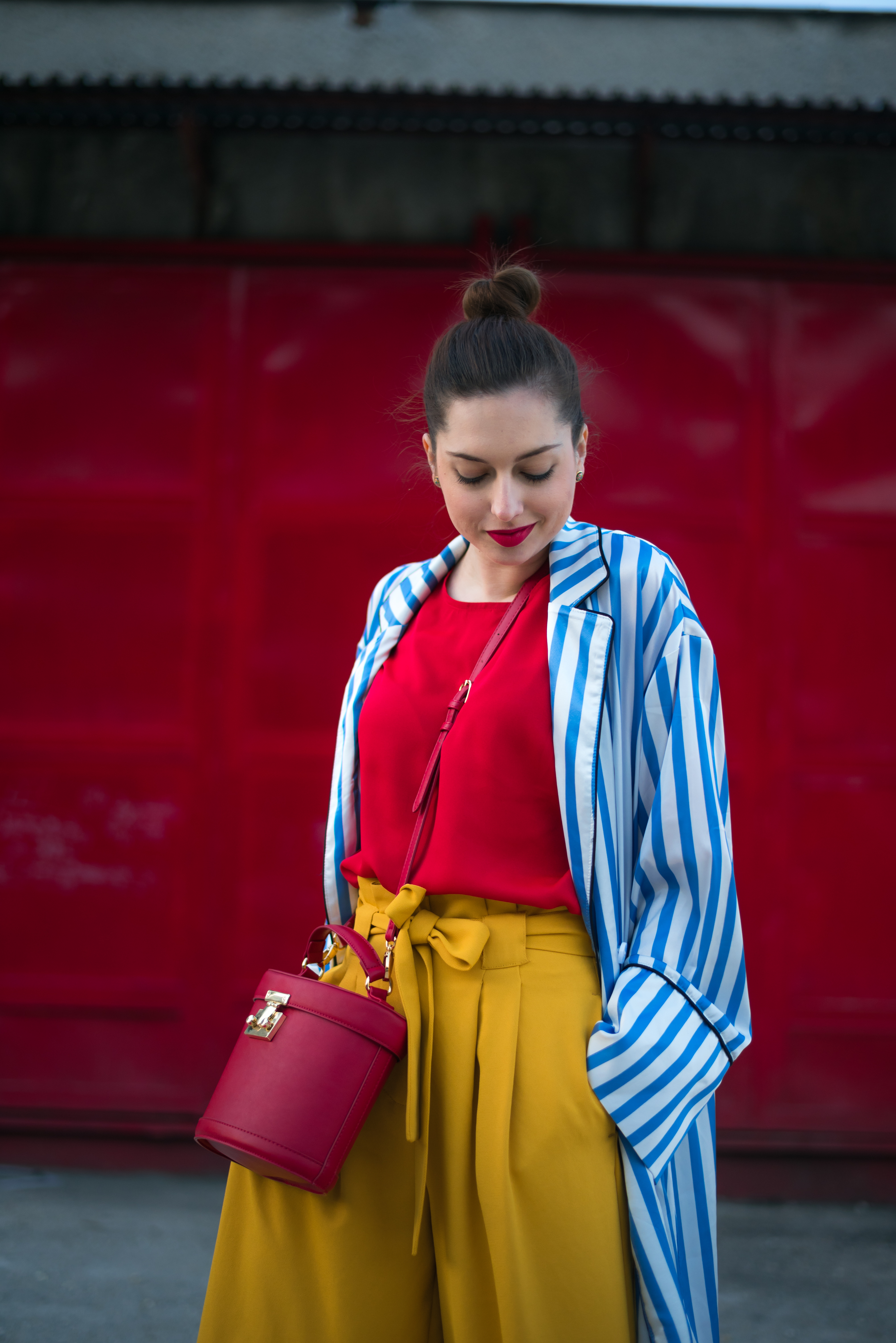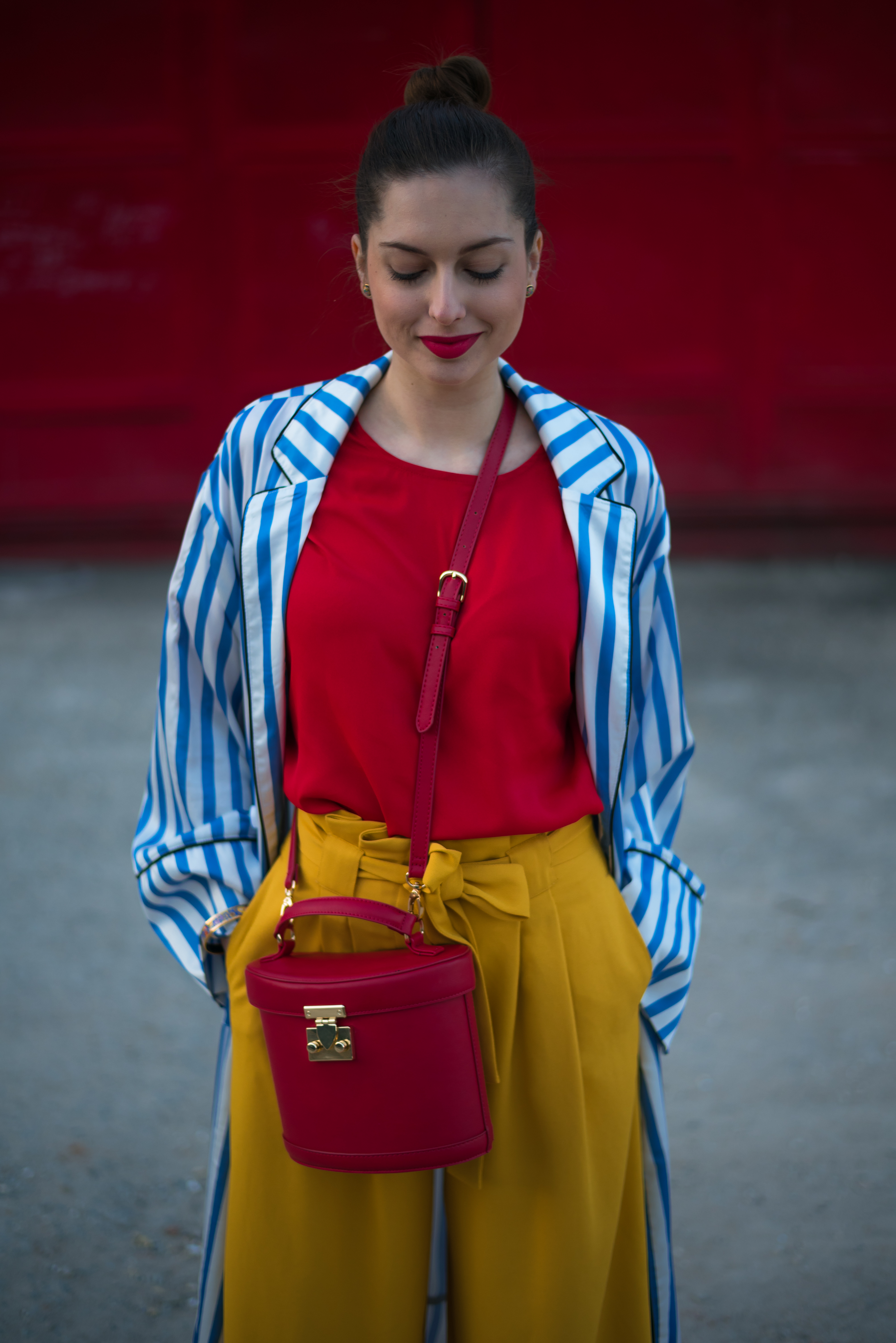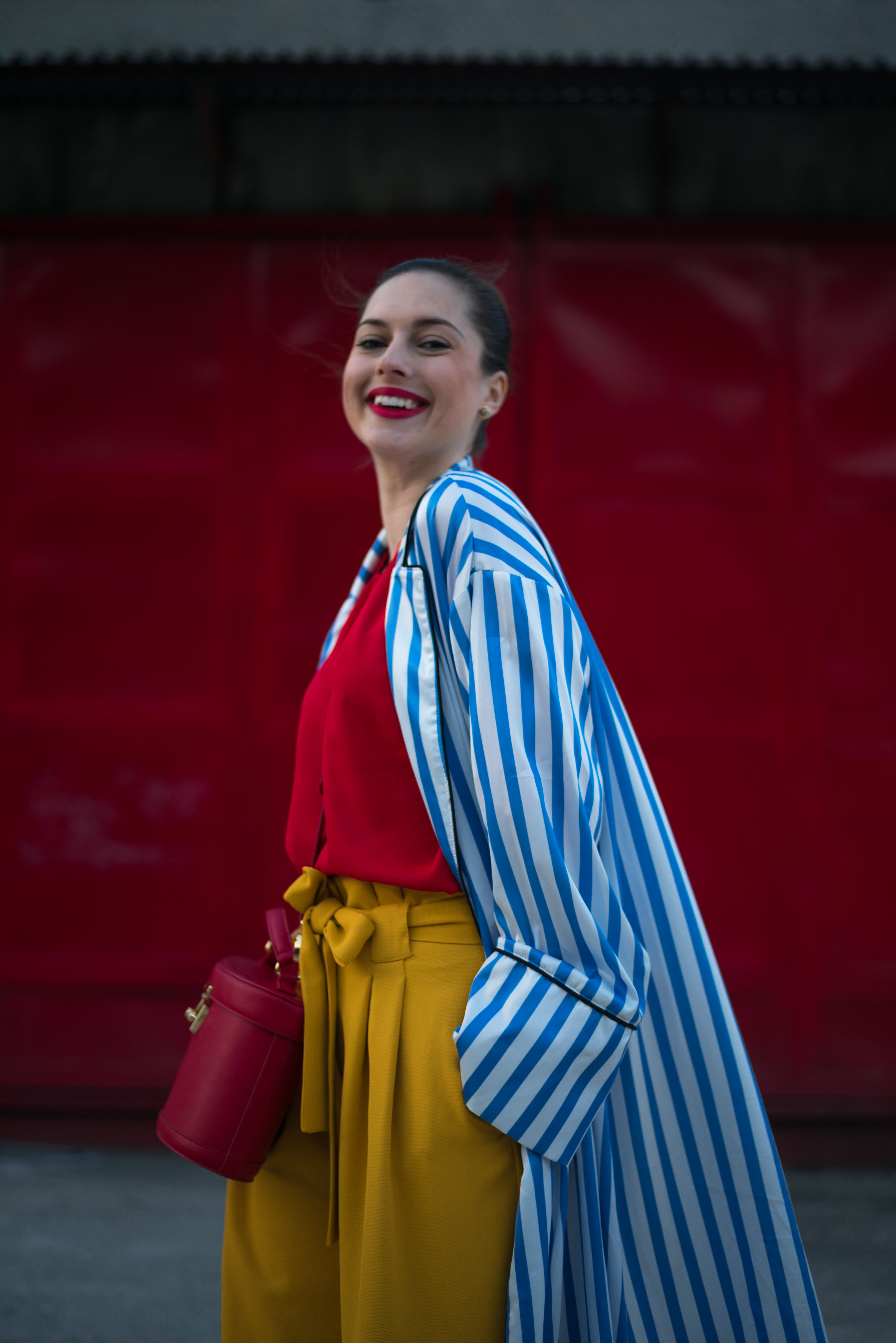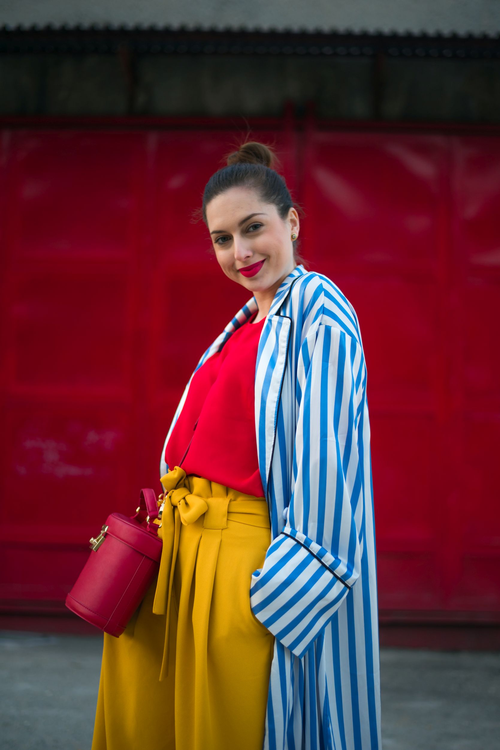 Bola to láska! Najskôr som ich objavila v ružovej verzii a chcela si kúpiť tie, no pri skúšobných kabínkach boli zavesené tieto žlté a zaujali ma o čosi viac. Dnes som ich skombinovala v štýle, ktorý pre mňa nie je úplne typický, no cítim sa v ňom perfektne. Voľné široké nohavice s vysokým pásom, dlhé voľné kimono a padavý top – skvelé trio, ktoré pasuje takmer každému typu postavy. Predĺži siluetu a celé je to veľmi pohodlné. A musím podotknúť, že kombinácia červenej, žltej a modrej ma robí neskutočne šťastnou! Tieto farby sú spolu tak pekne pozitívne…