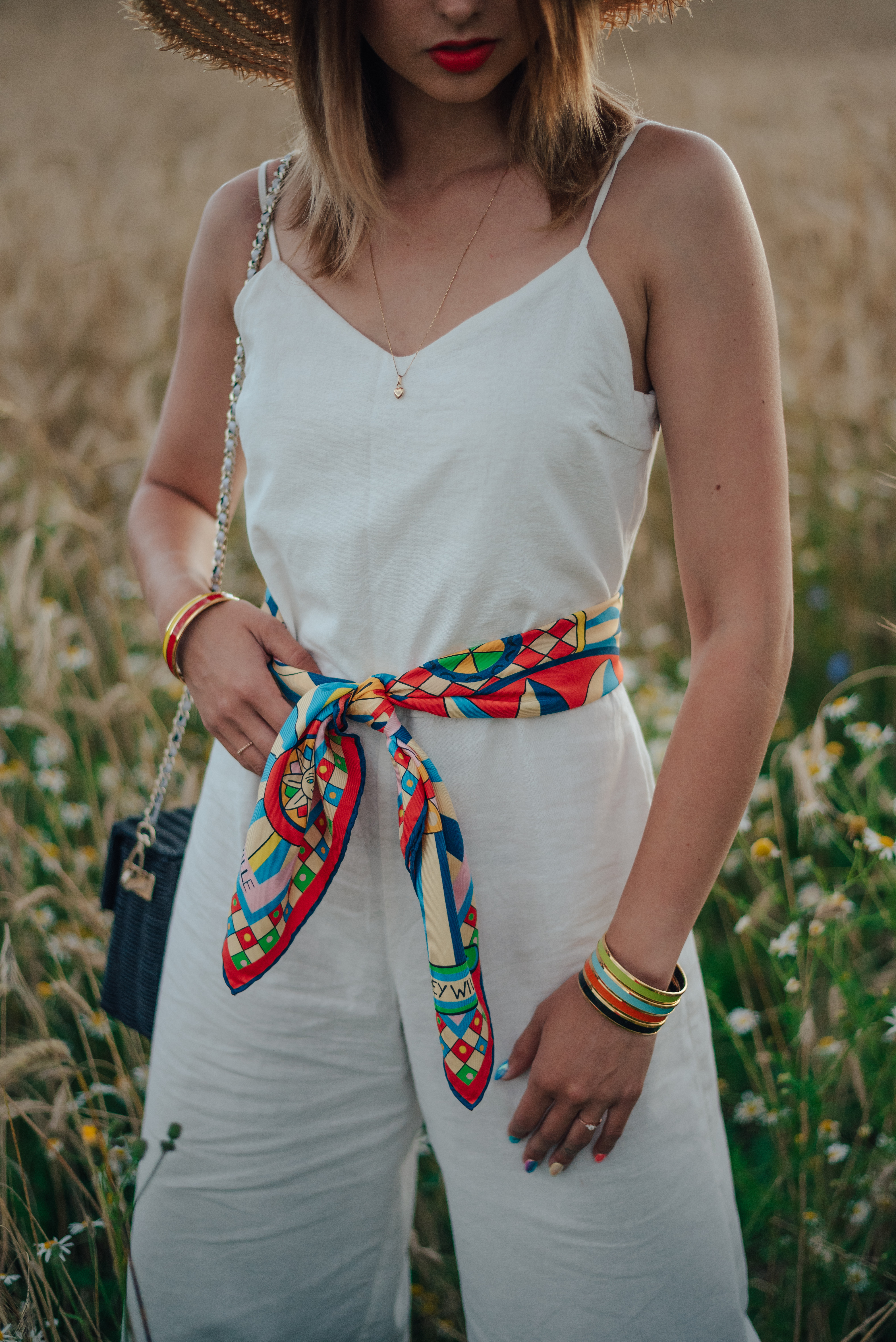 Overal: second-hand, Klobúk: Reserved, Kabelka: Zara, Šľapky: Reserved, Náramky: Freywille (kolekcia Monochrome), Šatka: Freywille, Retiazka so srdiečkom: vintage, Okuliare: Miu Miu // Eyerim
