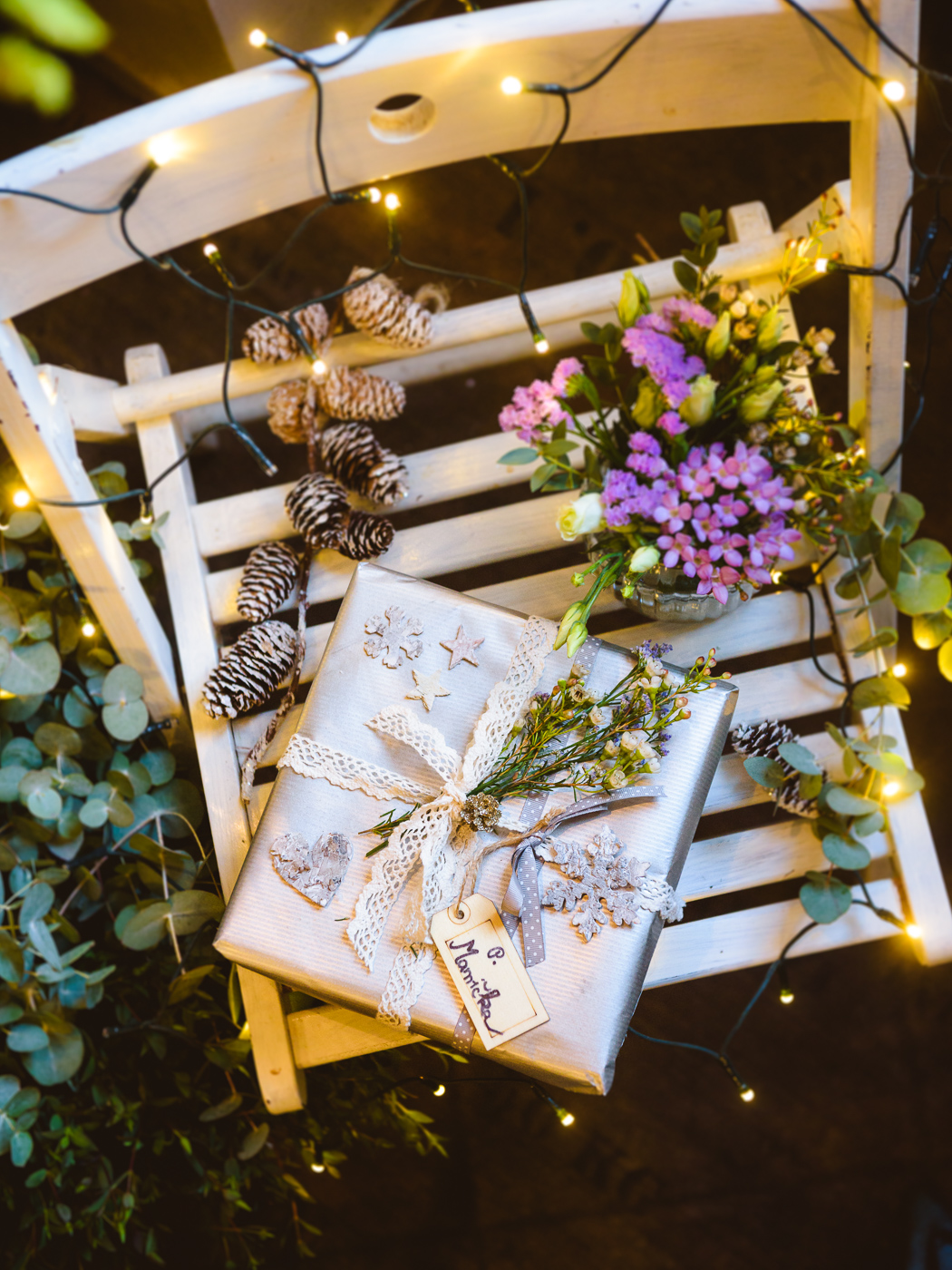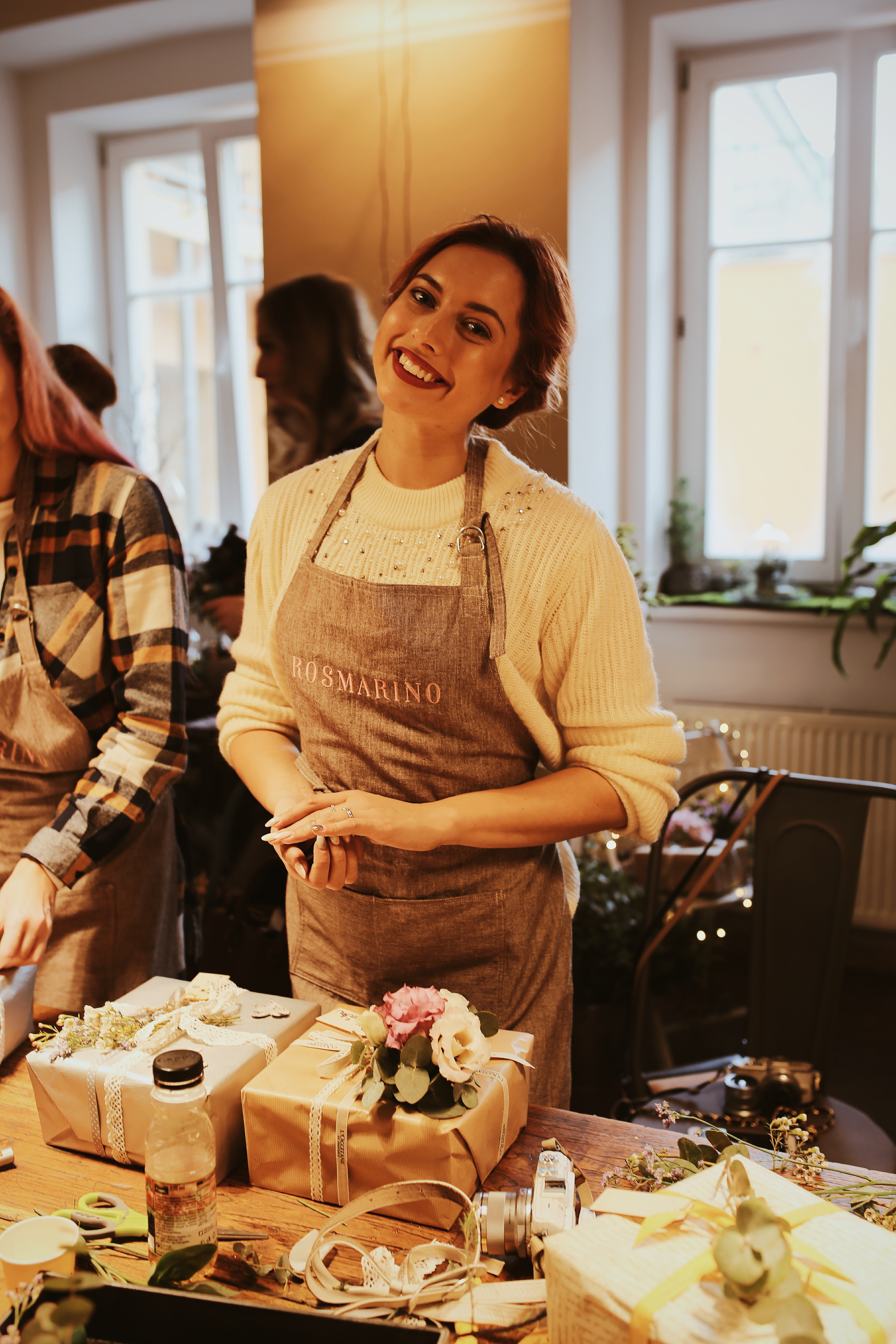 Na jednej strane som sa veľmi tešila, pretože nás čakalo balenie darčekov. Na strane druhej som bola pomerne vydesená, keďže balenie čohokoľvek (a možno aj kohokoľvek) mi absolútne nejde! S papierom večne bojujem a Vianoce sú pre mňa vždy najobávanejším obdobím v roku, keďže tých darčekov treba zabaliť hneď niekoľko. Musím však uznať, že som prekvapila samú seba! „Načančať“ a zabaliť darček mi totiž v dané poobedie išlo úplne od ruky a aj napriek tomu, že som to robila mne vlastným pomalým tempom, s výsledkom som bola nadmieru spokojná. Dokonca sme sa naučili pliesť aj čelenky zo živých kvetov!