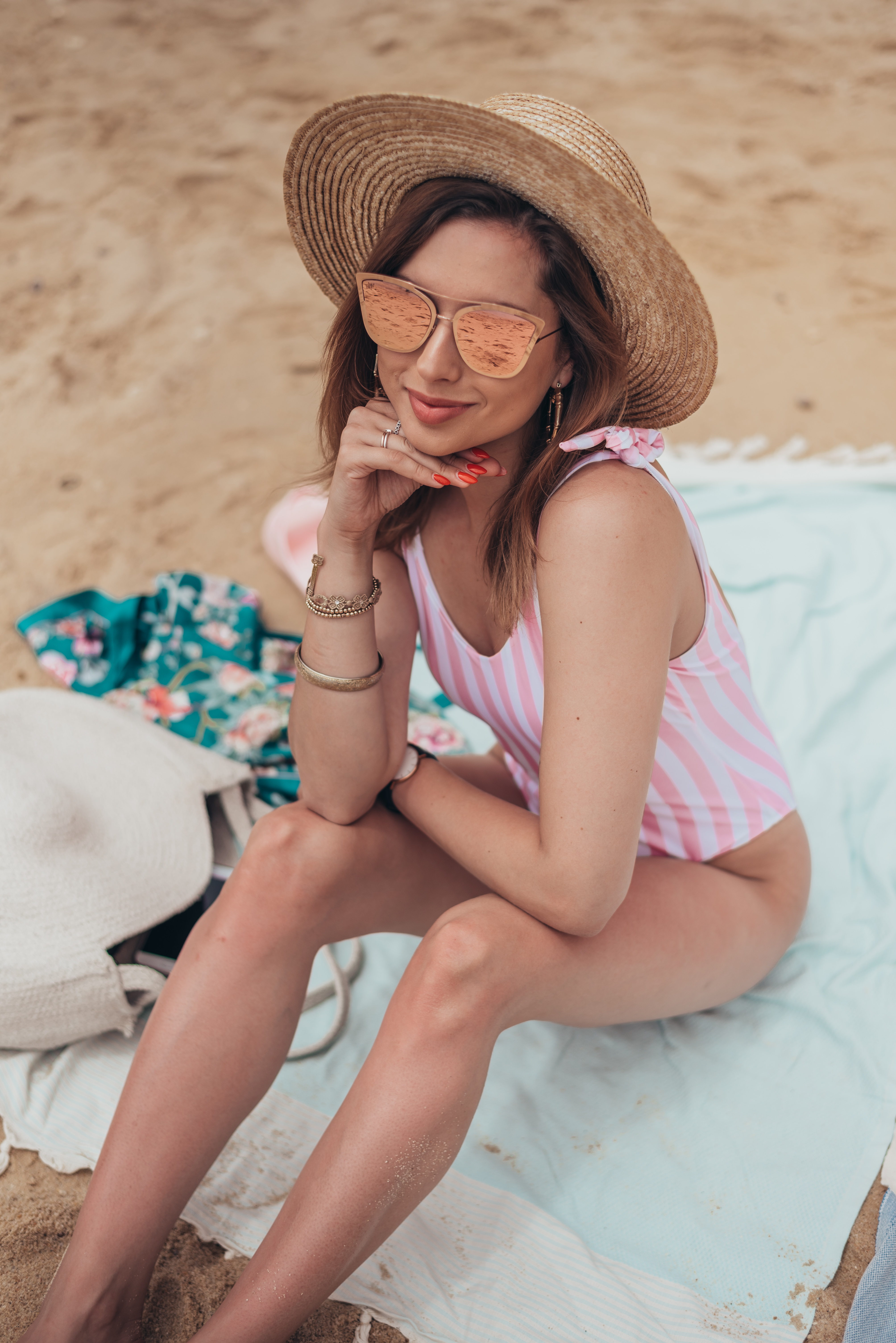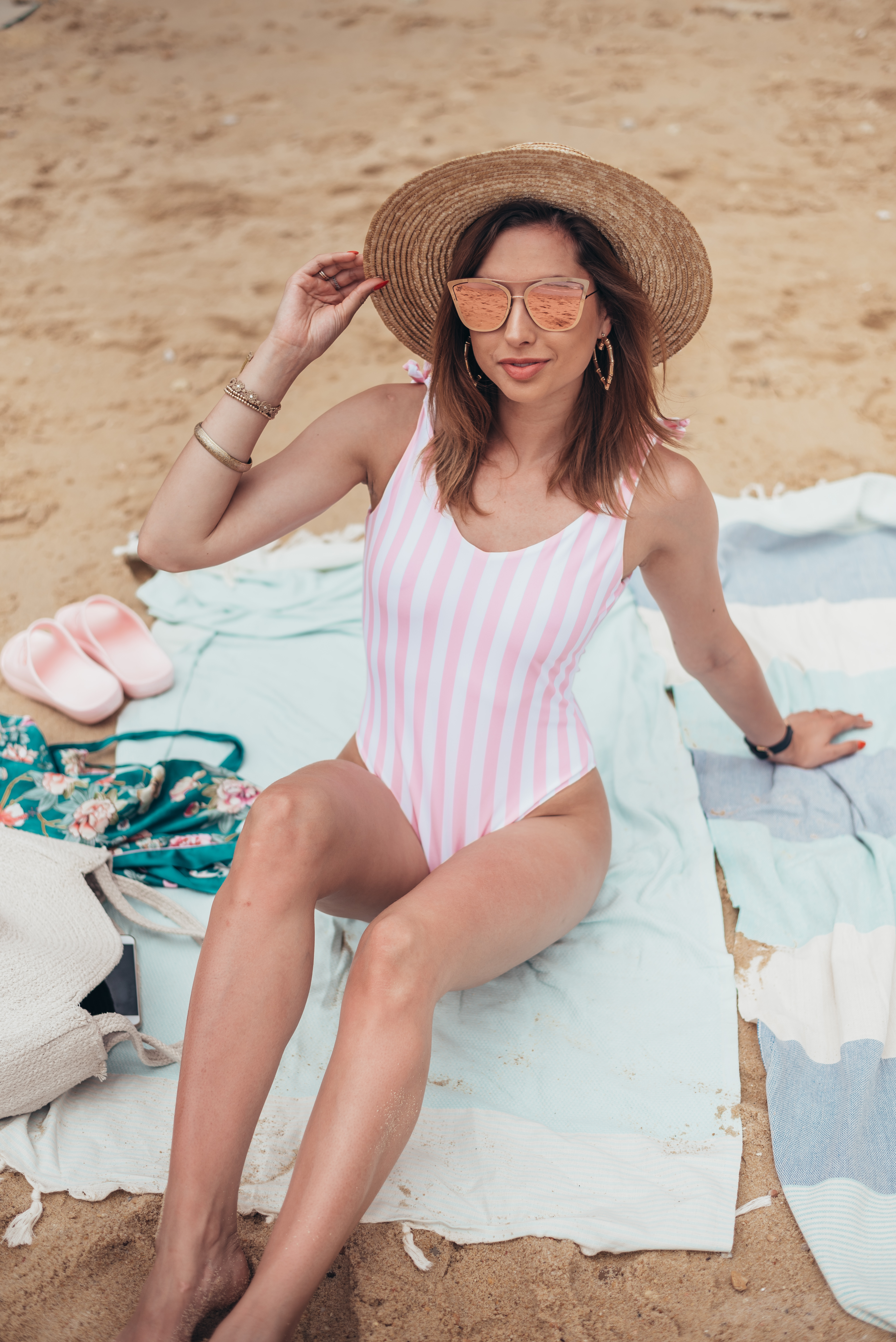 Plavky: Calzedonia, Klobúk: H&M, Okuliare: Bay Bay, Náušnice: Forever 21, Uteráky: Orientalne.sk (s kódom „SWEETLADY“ 15% zľava) & Suit Suit, Taška: Mango