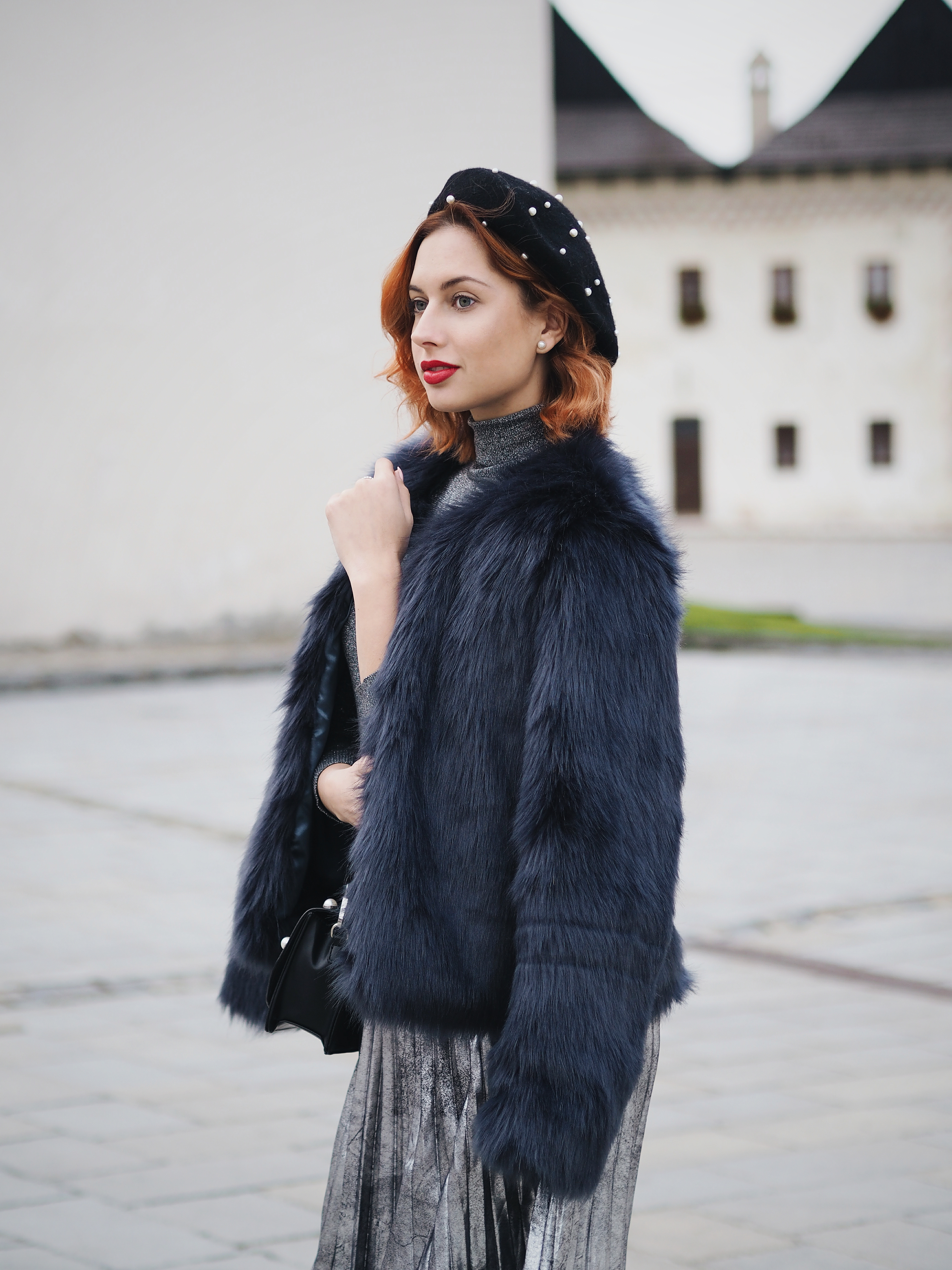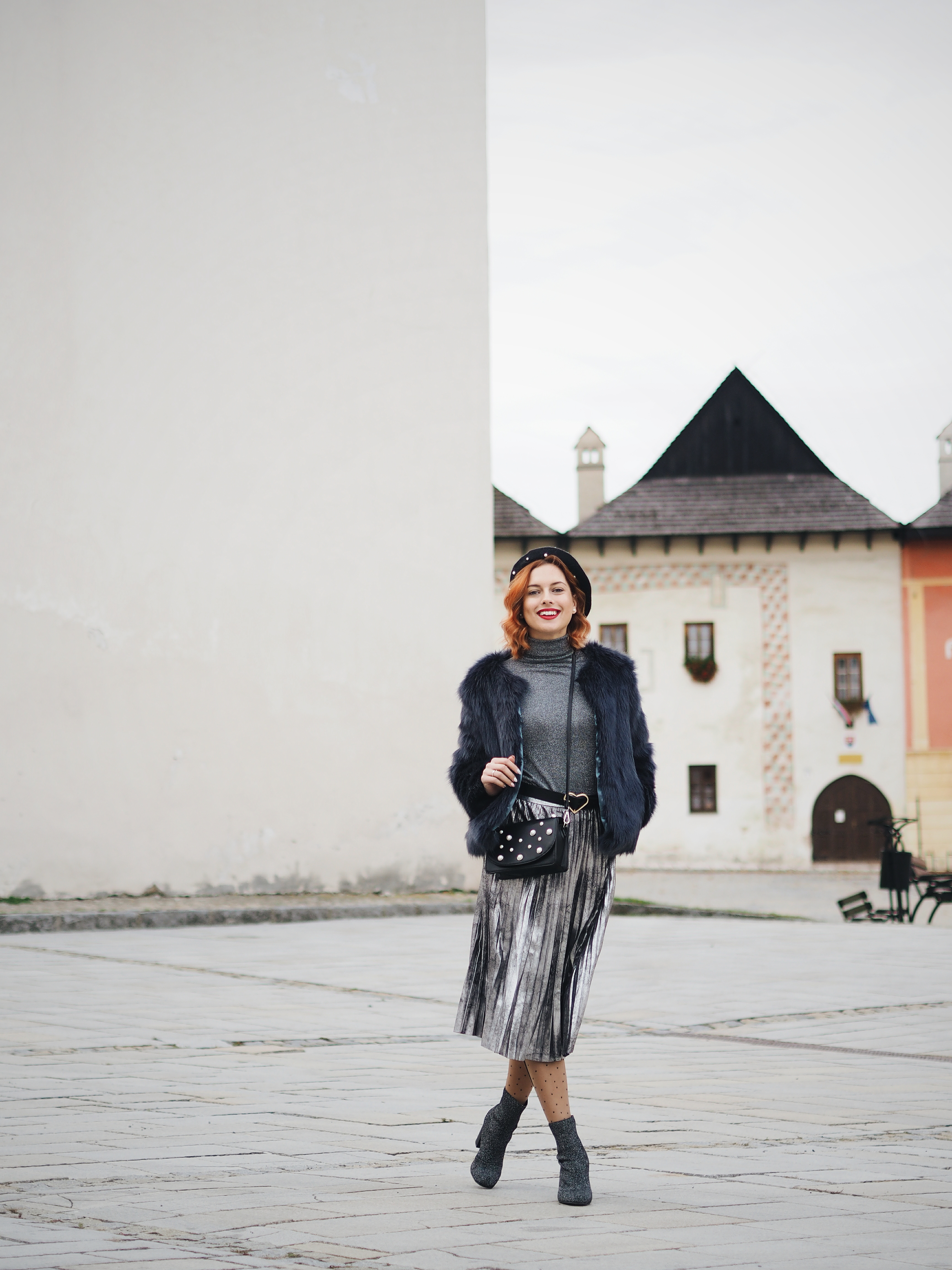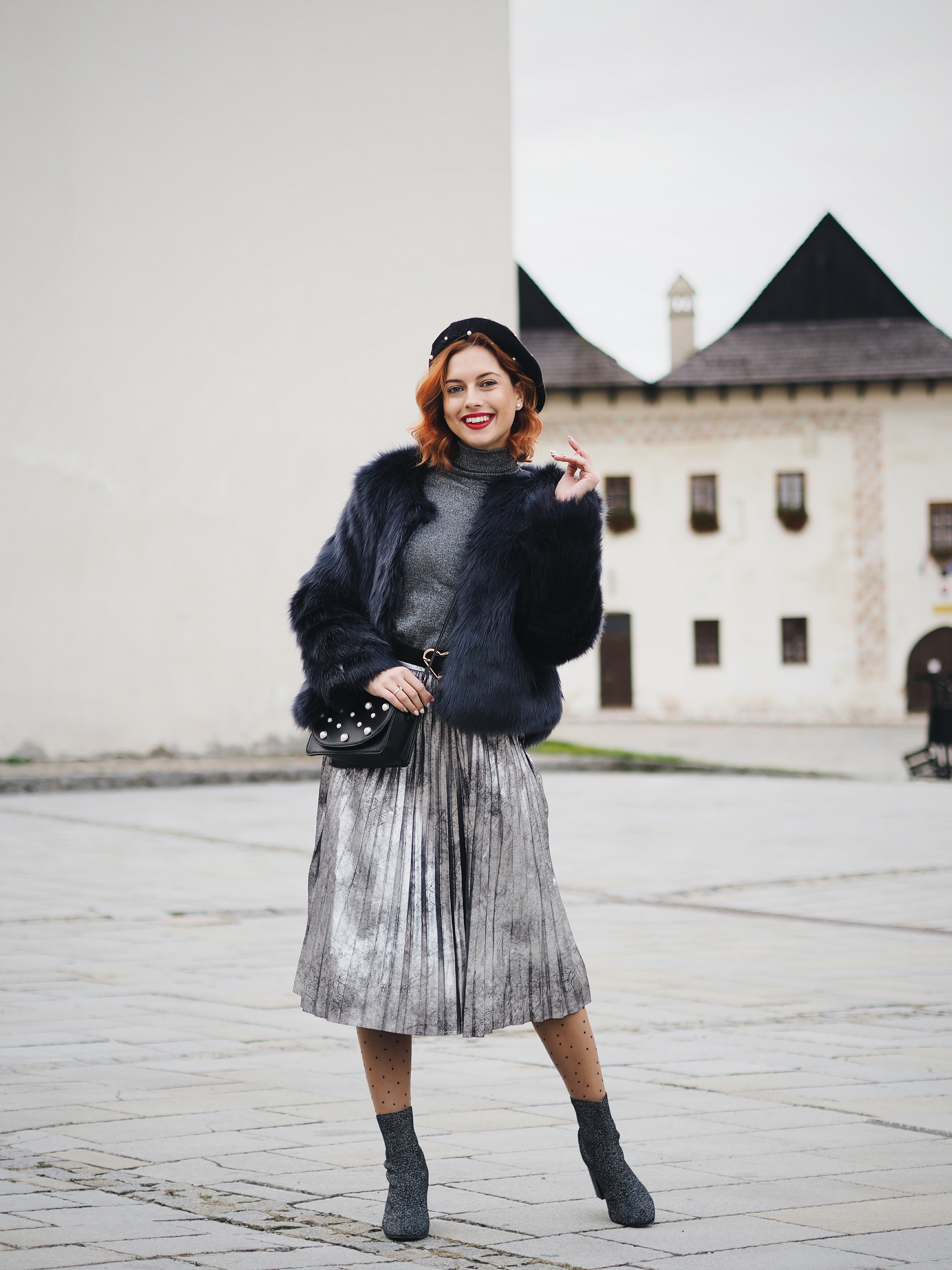 Topánky: Bullboxer // Answear (k dispozícii online tu), Silónky: Bepon & Simona Krainová (k dispozícii online tu), Sukňa: Klingel (k dispozícii online tu), Opasok: Mohito (v ružovej farbe k dispozícii online tu), Rolák: Primark, Kabelka: Mohito (k dispozícii online tu), Kožúšok: NAKD (k dispozícii online tu – s kódom „Ivana2“zľava 20% na nákup), Baretka: Mohito (v sivej farbe k dispozícii online tu)