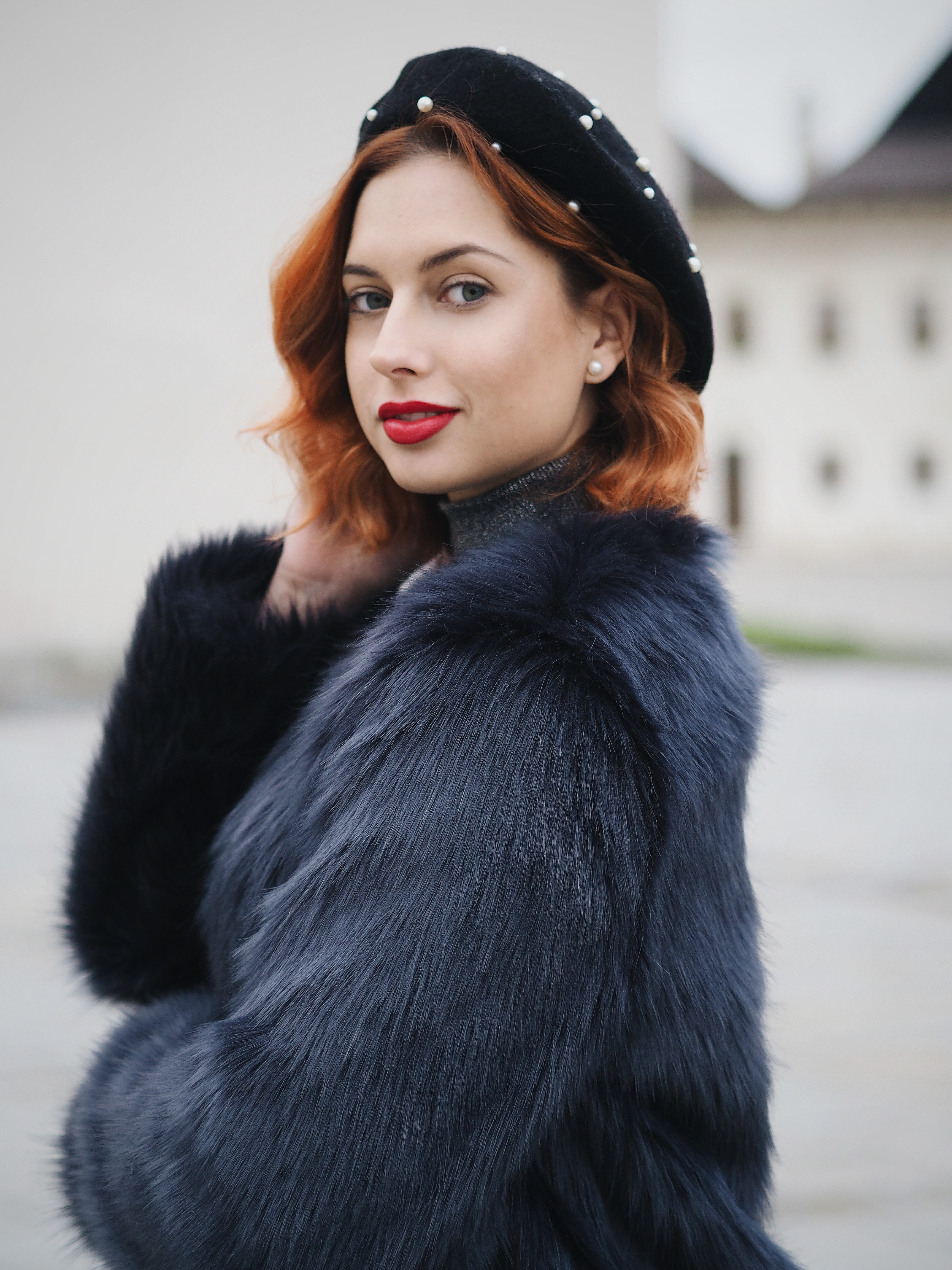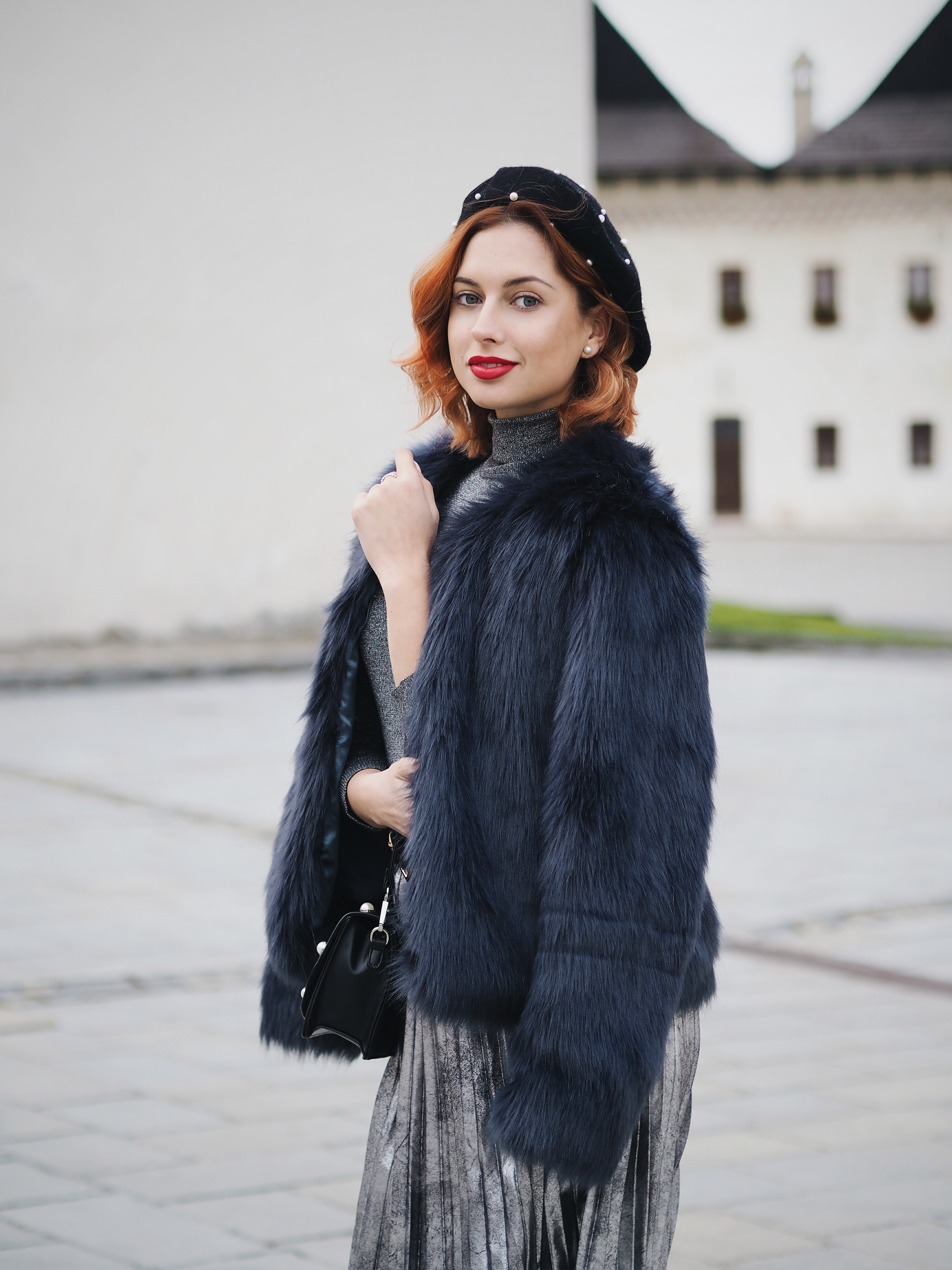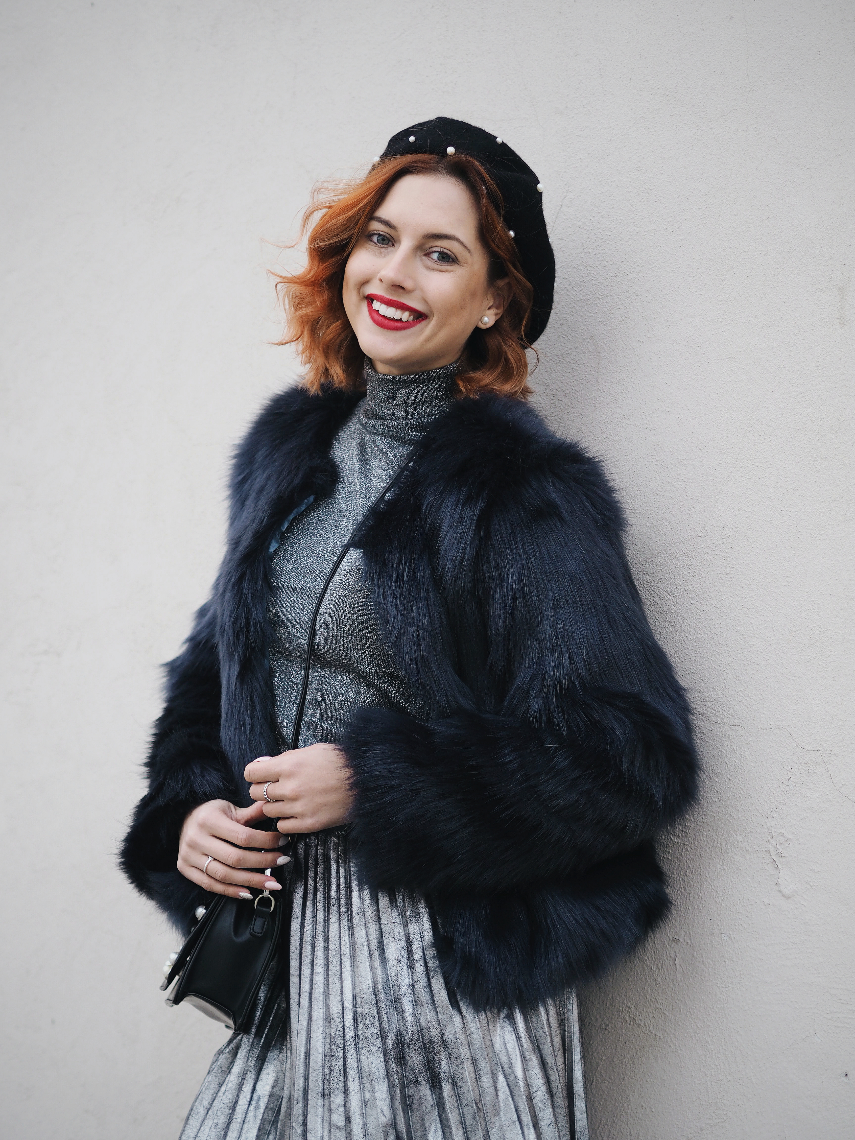 Topánky: Bullboxer // Answear (k dispozícii online tu), Silónky: Bepon & Simona Krainová (k dispozícii online tu), Sukňa: Klingel (k dispozícii online tu), Opasok: Mohito (v ružovej farbe k dispozícii online tu), Rolák: Primark, Kabelka: Mohito (k dispozícii online tu), Kožúšok: NAKD (k dispozícii online tu – s kódom „Ivana2“zľava 20% na nákup), Baretka: Mohito (v sivej farbe k dispozícii online tu)