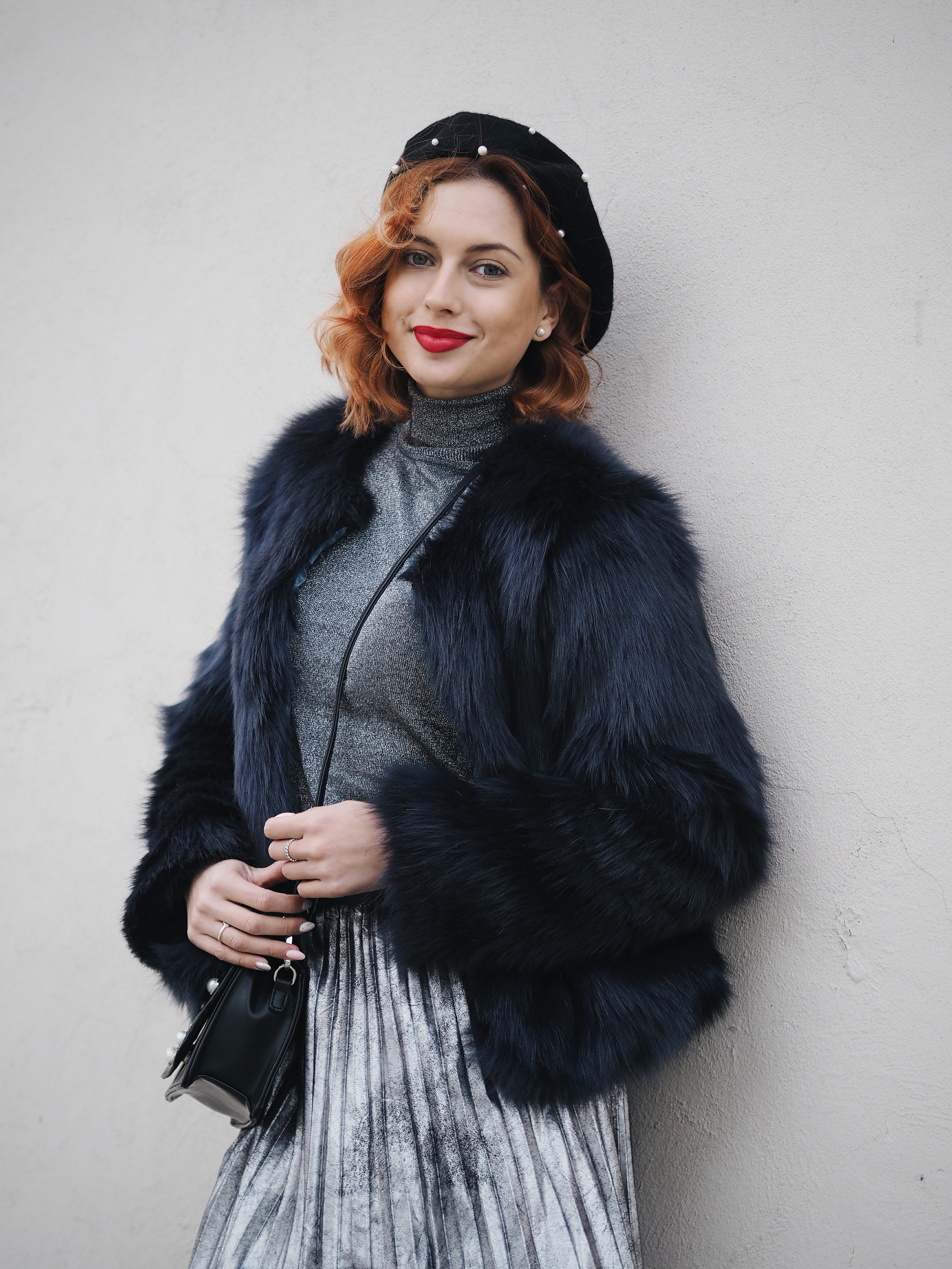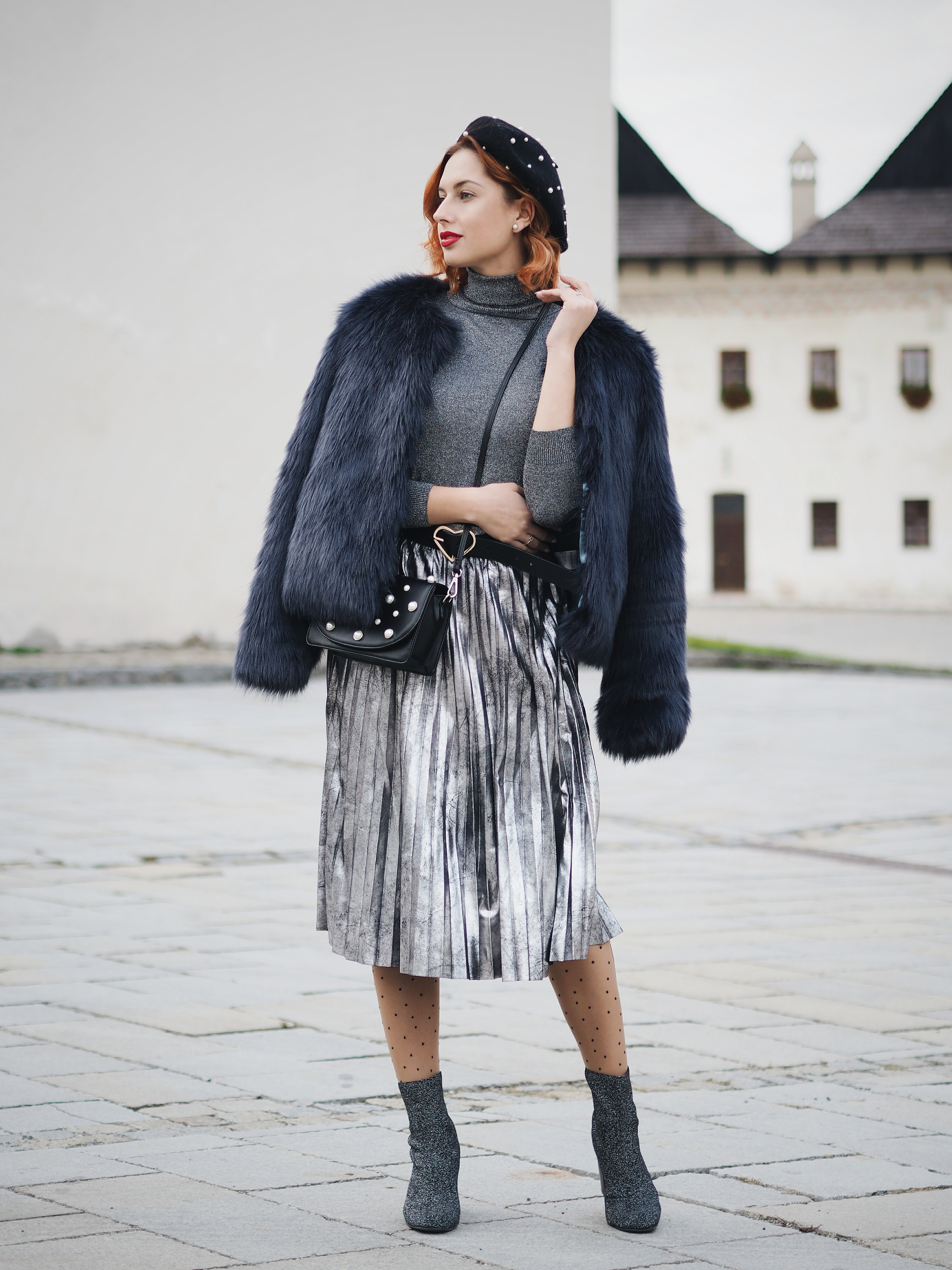 Dnes som si pre vás pripravila outfit s jemným retro nádychom, do ktorého som okrem metalického lesku zakomponovala ďalší trend tejto sezóny – perličky. Tie som si obľúbila najmä na doplnkoch, čo potvrdzuje aj moja dnešná kombinácia. Nakoľko je sukňa v outfite pomerne dominantná, rozhodla som sa uchýliť k tmavším farbám a outfit doplniť výrazným červeným rúžom.